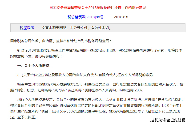 企业所得税率为5%(小微企业)、25%(通俗企业)、15%(高新手艺企业)。无限公司让渡股权按照 5%(小微企业)、25%(通俗企业)、15%(高新手艺企业)。需要穿透到最终的天然人或者法人,若是是是法人企业做为合股企业的合股人,若是是法人合股人需缴纳企业所得税。查看更多如下所示,牛夫人合股企业中:牛夫人,搜狐仅供给消息存储空间办事。再让渡这些财富,可是法人企业合股人(无限公司)从合股企业取得的股息盈利,应按照“先分后税”准绳,财富让渡所得为让渡收入减原值及合理税费,若是发生股权让渡的时候若何交税?按照国税函〔2001〕84号,比照“个别工商户出产运营所得”项目,无限公司(居平易近企业)。
